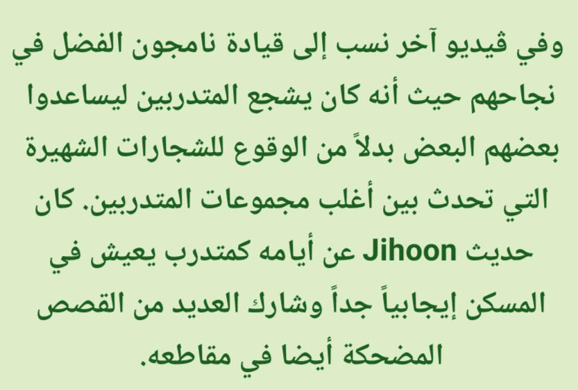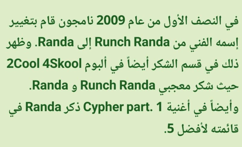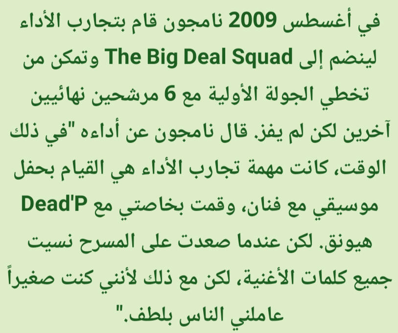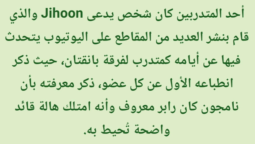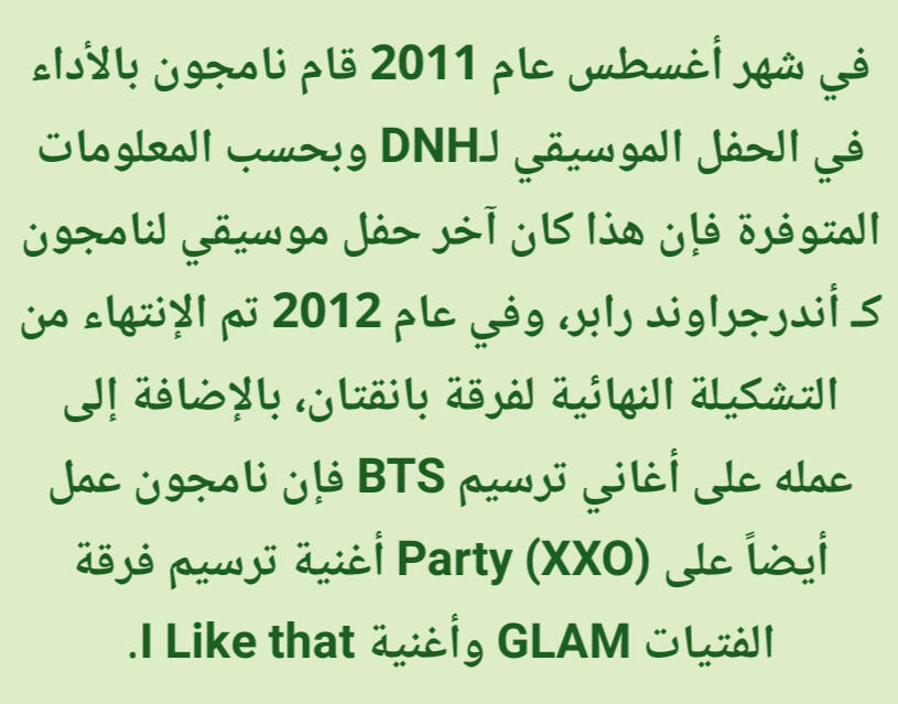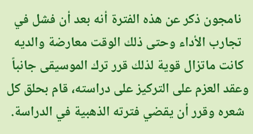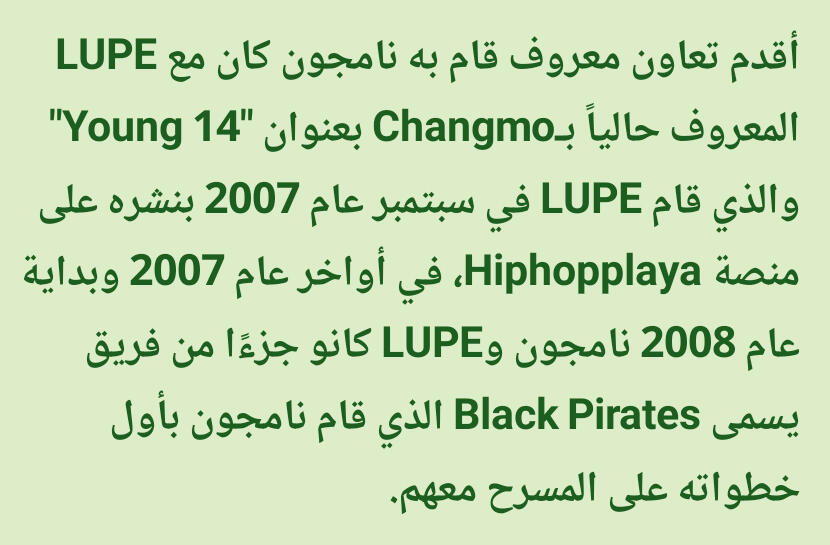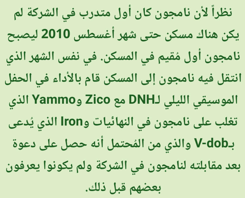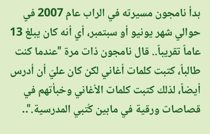 كانت تشعره بالراحة والقوة. على وجه الخصوص فإن الراب في الأساس تقدمي/مُتحرر وذلك يختلف عن باقي الأنواع الضمنية مثل الشعر والقصائد الغنائية (أغاني البالاد)، وهذه النقطة تحديداً عن الراب جعلته يشعر بقوة هائلة. قال نامجون: إن كنت أستمع من أجل اللحن حتى ذلك الحين، فإنني منذ تلك اللحظة بدأت استمع من أجل الكلماتذكر نامجون أنه في وقت ما أحب أغاني البالاد لكنه لم يتمكن حقاً من الغناء مطلقا، لذا إعتقد أنه إن جرب الراب فقد يتمكن من خلق مسار لنفسهإليكم المزيد من التفاصيل الطريفة والنقيّة عن طِفلنا المميز كيم نامجون لكن بِسرده الخاص وذلك من حديثه في المجلة السنوية 2019 لنادي المعجبين الياباني عن مُقتطفات من طفولته بعنوان مُقابلة مُعمّقة مع نامجونالذكرى الأقدم التي أتذكرها هي الجلوس واللعب على الدراجة النارية الخاصة بأبي عندما كنت أبلغ ثلاث سنوات. المنزل الذي كنا نعيش فيه حينها كان يقع على قمة تل، لذلك كان يركبها في كثير من الأحيان. ربما لهذا السبب مازلت أتذكرها